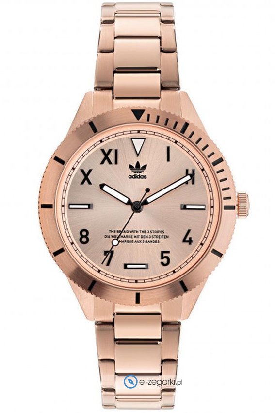 Model AOFH22063 marki Adidas to elegancki zegarek naręczny damski, który wyposażono w ciekawe rozwiązania i funkcje. Charakterystyczny wygląd zegarka osiągnięto m.in. poprzez tarczę w kolorze różowo złotym. Zegarek ten pokazuje godzinę w formacie analogowym dzięki czemu odczyt jest bardzo łatwy. Koperta jest w kolorze różowo złotym szeroka jest na 36 mm oraz ma grubość 8 mm - posiada okrągły kształt.