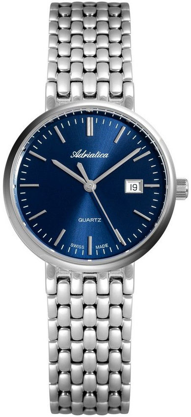Damski zegarek Adriatica A3170.5115Q to zegarek, który dzięki swemu wzornictwu zawsze będzie prezentował się dobrze. Tarcza zegarka jest w kolorze niebieskim. Godzina zaprezentowana jest w sposób analogowy co intuicyjnie pozwala ją odczytać. Koperta w barwach koloru srebrnego szeroka jest na 30 mm oraz ma grubość 7 mm - posiada okrągły kształt.