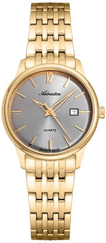 Zegarek damski A3254.1157Q marki Adriatica to dobre połączenie funkcjonalności a także ciekawego designu. Niebanalny wygląd czasomierza uzyskano także dzięki tarczy w kolorze szarym. Zegarek ten pokazuje godzinę w formacie analogowym dzięki temu odczyt jest bardzo łatwy. Koperta została ozdobiona kolorem złotym szeroka jest na 30 mm oraz ma grubość 8 mm - ma okrągły kształt.