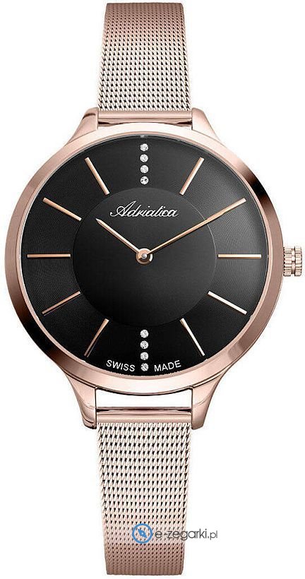 Zegarek damski A3433.9116Q marki Adriatica to ciekawa propozycja dla osób ceniących sobie dbałość o szczegóły jak również bezawaryjne zachowanie mechanizmów. Charakteru nadaje wysokiej klasy tarcza w kolorze czarnym. Zegarek ten pokazuje godzinę w formacie analogowym dzięki czemu odczyt jest intuicyjny. Koperta została pokryta kolorem różowo złotym szeroka jest na 36 mm - charakteryzuje się okrągłym kształtem.