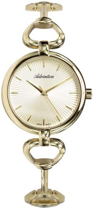 Model A3463.1111Q marki Adriatica to elegancki zegarek naręczny damski, który wyposażono w pomysłowe rozwiązania oraz funkcje. Charakteru nadaje wysokiej klasy tarcza w kolorze złotym. Zegarek ten prezentuje godzinę w formacie analogowym dzięki czemu odczyt jest intuicyjny. Koperta została ozdobiona kolorem złotym szeroka jest na 31 mm oraz ma grubość 11 mm - posiada okrągły kształt.