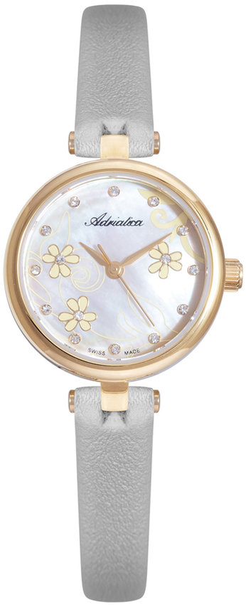 Model A3514.1G4FQ marki Adriatica to elegancki zegarek naręczny damski, który jest wyposażony w pomysłowe rozwiązania i funkcje. Atrakcyjną budowę zegarka osiągnięto z pomocą tarczy w kolorze białym. Aktualna godzina przedstawiona jest w sposób analogowy co niezmiernie łatwo pozwala ją odczytać. Koperta jest w kolorze złotym szeroka jest na 26 mm oraz ma grubość 7 mm - cechuje się okrągłym kształtem.