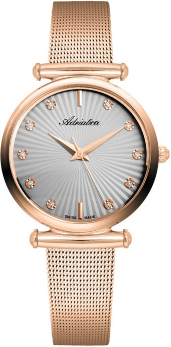 Damski zegarek Adriatica A3518.91R7Q to zegarek, który dzięki swemu wzornictwu zawsze będzie prezentował się dobrze. Wysokiej jakości tarczę zegarka ozdobiono szarym kolorem. Godzina przedstawiona jest w sposób analogowy co niezmiernie łatwo pozwala ją odczytać. Koperta jest pokryta kolorem różowo złotym szeroka jest na 33 mm oraz ma grubość 8 mm - cechuje się okrągłym kształtem.