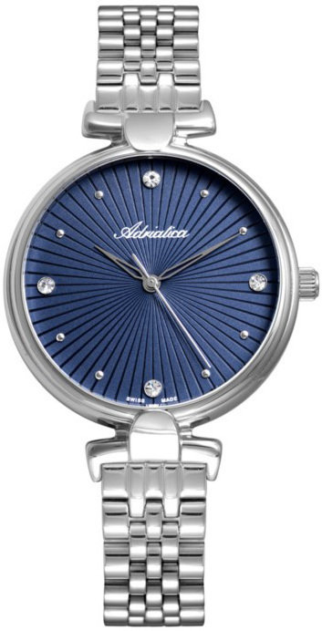 Zegarek damski A3530.5145Q marki Adriatica to ciekawa propozycja dla osób ceniących sobie dbałość o detale oraz bezawaryjne działanie mechanizmów. Cyferblat zegarka jest w kolorze niebieskim. Zegarek ten pokazuje aktualny czas w formacie analogowym dzięki czemu odczyt jest intuicyjny. Koperta w odcieniach koloru srebrnego szeroka jest na 35 mm oraz ma grubość 8 mm - cechuje się okrągłym kształtem.
