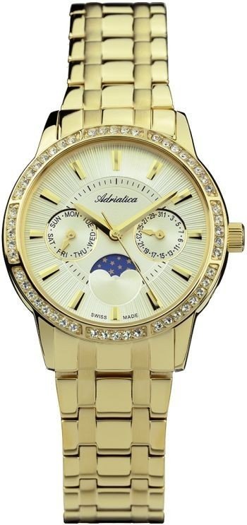 Zegarek damski A3601.1111QFZ marki Adriatica to idealna pozycja dla osób ceniących sobie dbałość o detale jak również sprawne funkcjonowanie mechanizmów. Niebanalny wygląd czasomierza uzyskano m.in. poprzez cyferblat w kolorze złotym. Pokazana metodą analogową bieżąca godzina jest czytelna i prosta do sprawdzenia. Koperta w barwach koloru złotego szeroka jest na 34 mm oraz ma grubość 9 mm - ma okrągły kształt.