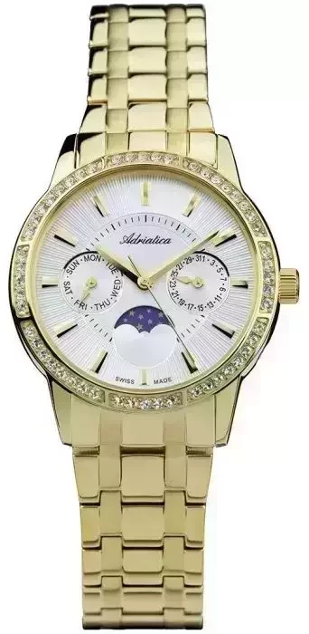 Damski zegarek Adriatica A3601.1113QFZ to zegarek, który dzięki swemu wzornictwu zawsze będzie prezentował się dobrze. Zaprezentowana metodą analogową aktualna godzina jest czytelna i łatwa do odczytania. Koperta została pokryta kolorem złotym szeroka jest na 34 mm oraz ma grubość 9 mm - w kształcie okrągłym.