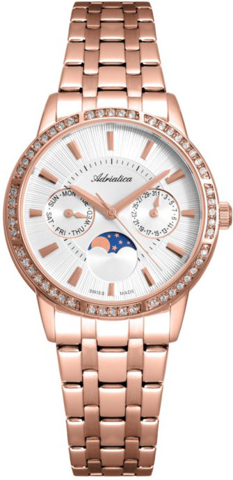 Model A3601.9113QFZ marki Adriatica to gustowny zegarek naręczny damski, który jest wyposażony w ciekawe rozwiązania i funkcje. Stylu dodaje wysokiej jakości tarcza w kolorze srebrnym. Zegarek ten pokazuje godzinę w formacie analogowym dzięki czemu odczyt jest bezproblemowy. Koperta jest w kolorze różowo złotym szeroka jest na 34 mm oraz ma grubość 9 mm - w kształcie okrągłym.