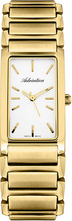Zegarek damski A3643.1113Q marki Adriatica to idealne połączenie funkcjonalności a także ciekawego wzornictwa. Cyferblat zegarka jest w kolorze białym. Pokazana metodą analogową bieżąca godzina jest czytelna i łatwa do odczytania. Koperta została pokryta kolorem złotym szeroka jest na 20 mm oraz ma grubość 7 mm - ma prostokątny kształt.