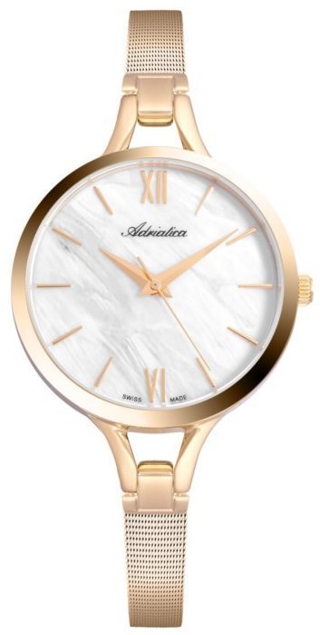 Zegarek damski A3739.116FQ marki Adriatica to idealne połączenie funkcjonalności a także modnego wzornictwa. Stylu dodaje wysokiej klasy cyferblat w kolorze perłowym. Zegarek ten pokazuje aktualny czas w formacie analogowym dzięki temu odczyt jest bezproblemowy. Koperta jest w kolorze złotym szeroka jest na 30 mm oraz ma grubość 8 mm - wyróżnia się okrągłym kształtem.