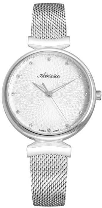 Zegarek damski A3748.5143Q marki Adriatica to ciekawa propozycja dla ludzi ceniących sobie dbałość o szczegóły jak również sprawne działanie mechanizmów. Wysokiej trwałości cyferblat zegarka pokryto srebrnym kolorem. Zaprezentowana metodą analogową bieżąca godzina jest czytelna i łatwa do sprawdzenia. Koperta jest w kolorze srebrnym szeroka jest na 34 mm oraz ma grubość 7 mm - cechuje się okrągłym kształtem.