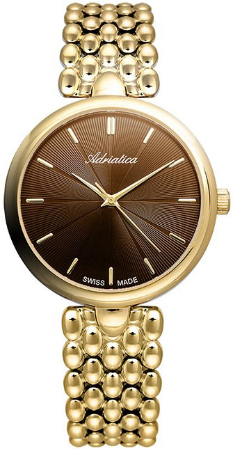 Model A3770.111GQ marki Adriatica to elegancki zegarek naręczny damski, który wyposażono w pomysłowe rozwiązania i funkcje. Nieschematyczny wygląd zegarka uzyskano m.in. poprzez tarczę w kolorze brązowym. Pokazana metodą analogową aktualna godzina jest czytelna i łatwa do odczytania. Koperta jest pokryta kolorem złotym szeroka jest na 36 mm oraz ma grubość 8 mm - w kształcie okrągłym.
