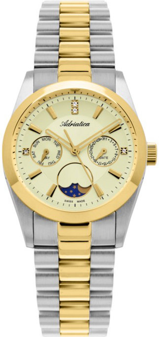 Zegarek damski A3802.2191QF marki Adriatica to idealna propozycja dla osób ceniących sobie dbałość o szczegóły jak również sprawne zachowanie mechanizmów. Charakteru dodaje wysokiej jakości tarcza w kolorze złotym. Aktualna godzina prezentowana jest w sposób analogowy co niezmiernie łatwo pozwala ją odczytać. Koperta w barwach koloru srebrnego szeroka jest na 35 mm oraz ma grubość 10 mm - ma okrągły kształt.