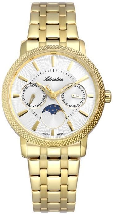 Zegarek damski A3808.1113QF marki Adriatica to idealna propozycja dla ludzi ceniących sobie dbałość o szczegóły jak również bezproblemowe funkcjonowanie mechanizmów. Wysokiej trwałości cyferblat zegarka ozdobiono złotym kolorem. Zegarek ten pokazuje aktualny czas w formacie analogowym dzięki temu odczyt jest bardzo łatwy. Koperta w barwach koloru złotego szeroka jest na 35 mm oraz ma grubość 9 mm - ma okrągły kształt.