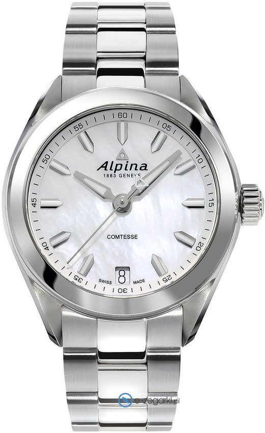 Zegarek damski AL-240MPW2C6B marki Alpina z serii Alpina Comtesse. Pokazana metodą analogową bieżąca godzina jest czytelna i prosta do odczytania. Koperta szeroka jest na 34 mm - w kształcie okrągłym.