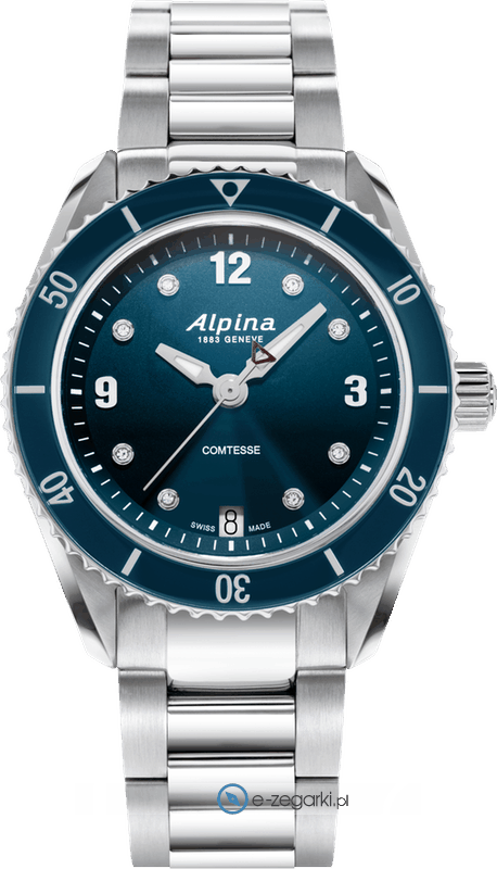 Zegarek damski AL-240ND3C6B marki Alpina to idealne połączenie funkcjonalności oraz modnego designu. Model ten zalicza się do serii Alpina Comtesse. Wysokiej trwałości cyferblat zegarka ozdobiono niebieskim kolorem. Pokazana metodą analogową bieżąca godzina jest czytelna i prosta do sprawdzenia. Koperta jest w kolorze srebrnym szeroka jest na 37 mm oraz ma grubość 10 mm - ma okrągły kształt.