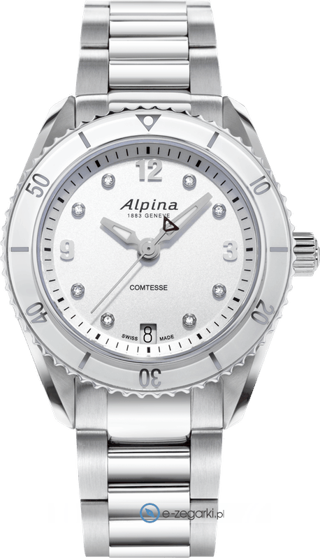 Zegarek damski AL-240SD3C6B marki Alpina to dobre połączenie funkcjonalności a także modnego designu. Model ten należy do serii Alpina Comtesse. Charakterystyczną budowę czasomierza uzyskano dzięki tarczy w kolorze białym. Zaprezentowana metodą analogową aktualna godzina jest czytelna i łatwa do odczytania. Koperta w barwach koloru srebrnego szeroka jest na 37 mm oraz ma grubość 10 mm - w kształcie okrągłym.