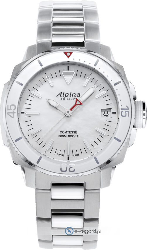 Damski zegarek AL-240MPW2VC6B z kolekcji Alpina Seastrong marki Alpina to połączenie estetyki oraz nowatorskich mechanizmów. Cyferblat zegarka w kolorze perłowym. Aktualna godzina przedstawiona jest w sposób analogowy co bez trudu pozwala ją odczytać. Koperta w barwach koloru srebrnego szeroka jest na 34 mm oraz ma grubość 10 mm - wyróżnia się okrągłym kształtem.