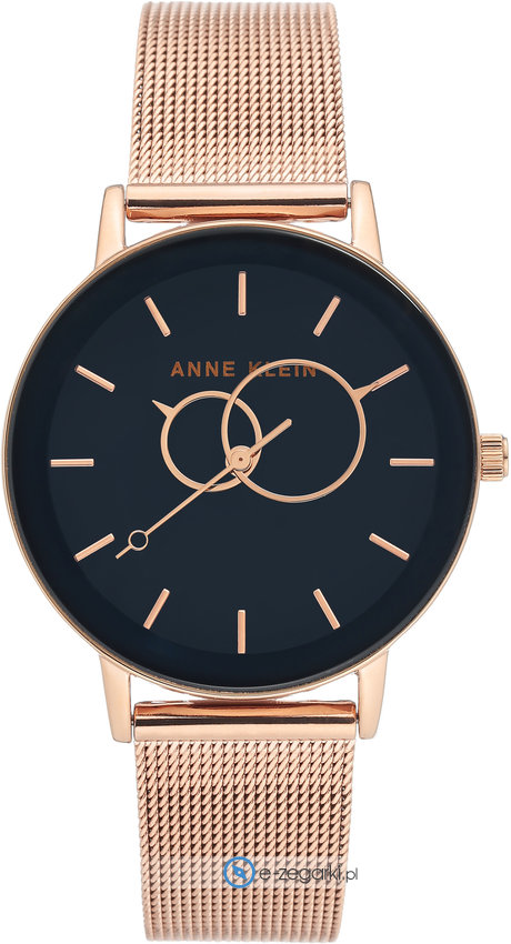 Model AK-3450NVRG marki Anne Klein to elegancki zegarek naręczny damski, który wyposażono w pomysłowe rozwiązania oraz funkcje. Stylu nadaje wysokiej klasy cyferblat w kolorze czarnym. Zegarek ten pokazuje godzinę w formacie analogowym dzięki temu odczyt jest intuicyjny. Koperta szeroka jest na 34 mm oraz ma grubość 9 mm - w kształcie okrągłym.