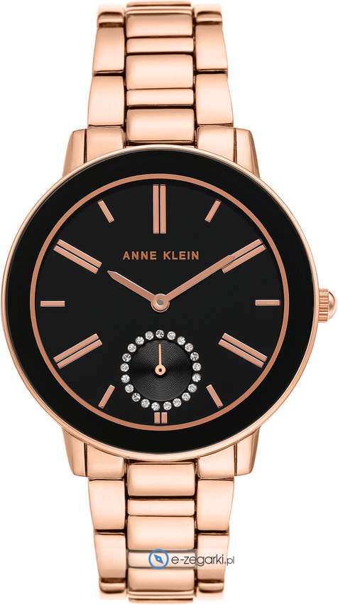 Model AK-3484BKRG marki Anne Klein to elegancki zegarek naręczny damski, który posiada ciekawe rozwiązania oraz funkcje. Niebanalny wygląd zegarka uzyskano także dzięki tarczy w kolorze czarnym. Godzina prezentowana jest w sposób analogowy co intuicyjnie pozwala ją odczytać. Koperta szeroka jest na 34 mm oraz ma grubość 8 mm - w kształcie okrągłym.