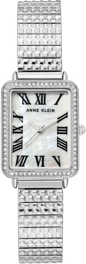 Zegarek damski AK-3803MPSV marki Anne Klein to dobre połączenie funkcjonalności oraz modnego designu. Tarcza zegarka w kolorze perłowym. Pokazana metodą analogową aktualna godzina jest czytelna i szybka do sprawdzenia. Koperta została pokryta kolorem srebrnym szeroka jest na 24 mm oraz ma grubość 8 mm - posiada prostokątny kształt.