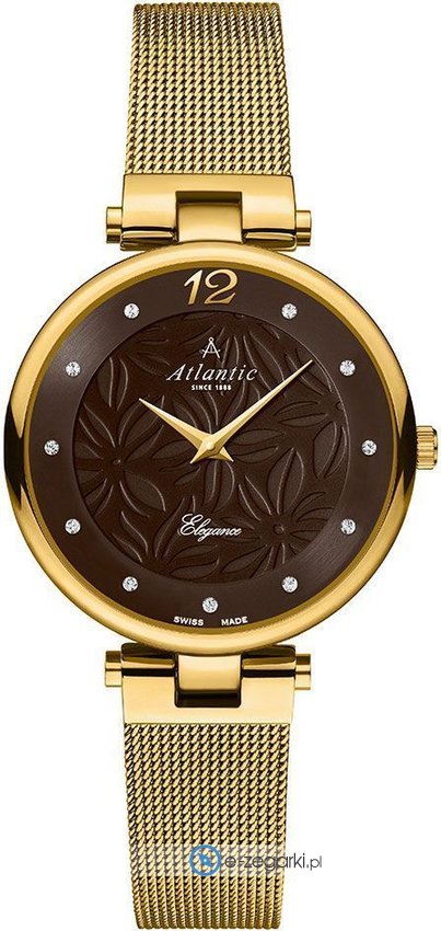 Damski zegarek 29037.45.81MB z kolekcji Atlantic Elegance marki Atlantic to połączenie smaku oraz nowatorskich funkcji. Cyferblat zegarka w kolorze brązowym. Zegarek ten prezentuje godzinę w formacie analogowym dzięki temu odczyt jest intuicyjny. Koperta jest ozdobiona kolorem złotym szeroka jest na 33 mm oraz ma grubość 8 mm - ma okrągły kształt.