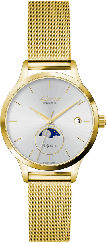 Zegarek damski 29040.45.21MB marki Atlantic należy do rodziny Atlantic Elegance. Cyferblat zegarka w kolorze srebrnym. Pokazana metodą analogową bieżąca godzina jest czytelna i prosta do odczytania. Koperta jest ozdobiona kolorem złotym szeroka jest na 32 mm oraz ma grubość 7 mm - w kształcie okrągłym.
