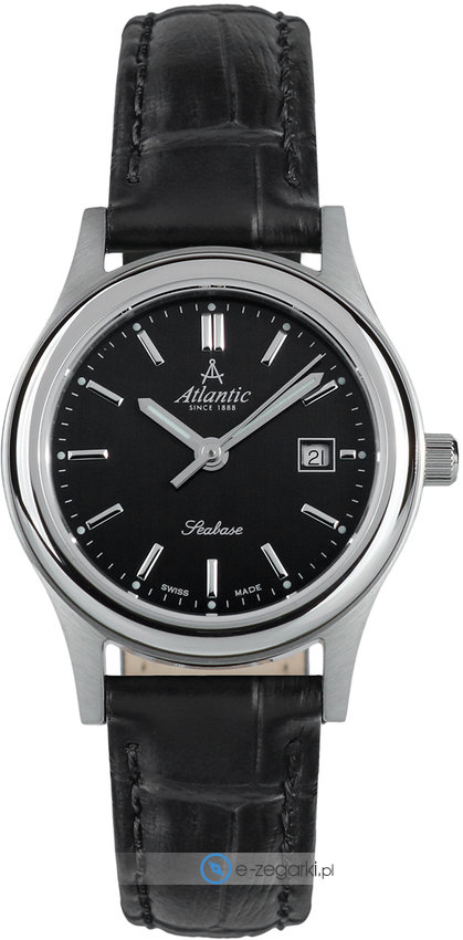 Zegarek damski 20343.41.61 marki Atlantic z kolekcji Atlantic Seabase. Nieschematyczny wygląd zegarka osiągnięto także dzięki tarczy w kolorze czarnym. Pokazana metodą analogową bieżąca godzina jest czytelna i prosta do odczytania. Koperta została ozdobiona kolorem srebrnym szeroka jest na 27 mm oraz ma grubość 7 mm - w kształcie okrągłym.