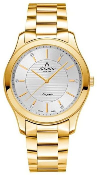 Model damski 20335.45.21 z kolekcji Atlantic Seapair marki Atlantic. Cyferblat zegarka w kolorze srebrnym. Koperta w barwach koloru złotego szeroka jest na 28 mm oraz ma grubość 8 mm - ma okrągły kształt.