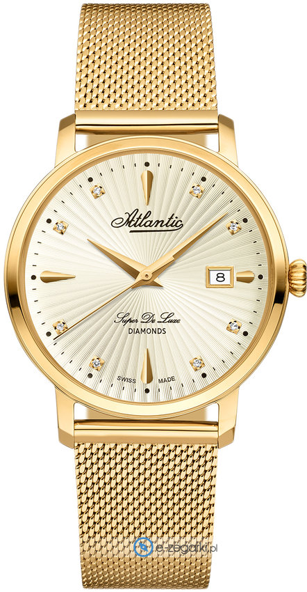 Zegarek damski 29355.45.37 marki Atlantic to idealne połączenie funkcjonalności i modnego wzornictwa. Model ten zalicza się do serii Atlantic Super De Luxe. Niebanalny wygląd zegarka uzyskano również dzięki tarczy w kolorze złotym. Aktualna godzina przedstawiona jest w sposób analogowy co niezmiernie łatwo pozwala ją odczytać. Koperta jest w kolorze złotym szeroka jest na 36 mm oraz ma grubość 8 mm - w kształcie okrągłym.