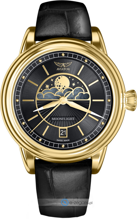 Model damski V.1.33.1.344.4 marki Aviator należy do rodziny Aviator Moonflight. Charakter zapewnia wysokiej klasy cyferblat w kolorze czarnym. Zegarek ten prezentuje godzinę w formacie analogowym dzięki temu odczyt jest bezproblemowy. Koperta w barwach koloru złotego szeroka jest na 36 mm oraz ma grubość 10 mm - cechuje się okrągłym kształtem.
