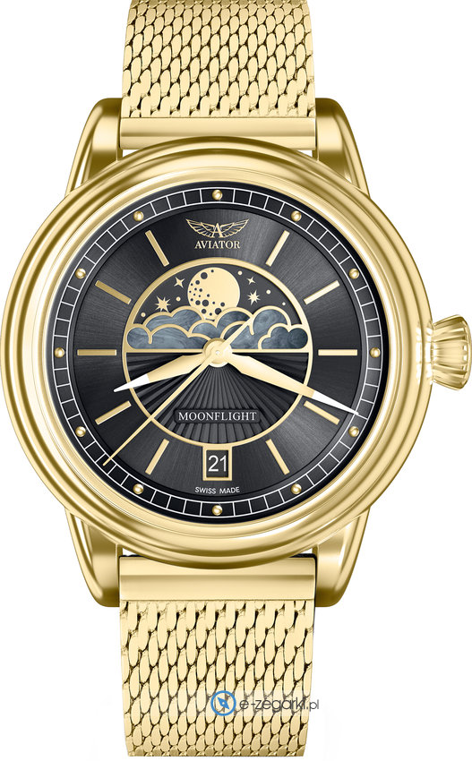 Zegarek damski V.1.33.1.344.5 marki Aviator to idealne połączenie funkcjonalności oraz ciekawego designu. Model ten w gamie pozostałych zegarków tego producenta występuje w serii Aviator Moonflight. Tarcza zegarka jest w kolorze czarnym. Zegarek ten pokazuje aktualny czas w formacie analogowym dzięki czemu odczyt jest bezproblemowy. Koperta w odcieniach koloru złotego szeroka jest na 35 mm oraz ma grubość 10 mm - wyróżnia się okrągłym kształtem.