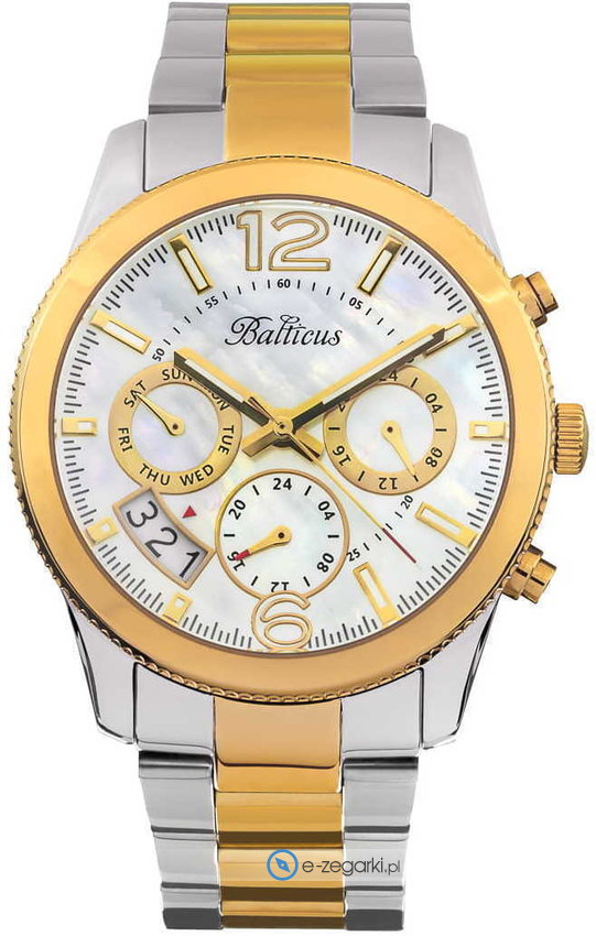 Model damski BLT-VR-SG marki Balticus z serii Balticus Sky Variety. Cyferblat zegarka jest w kolorze jasnym. Aktualna godzina pokazywana jest w sposób analogowy co intuicyjnie pozwala ją odczytać. Koperta jest pokryta kolorem srebrno złotym szeroka jest na 38 mm oraz ma grubość 11 mm - posiada okrągły kształt.