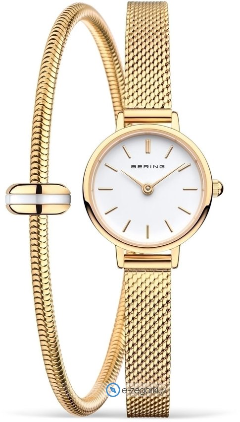 Zegarek damski 11022-334-SET marki Bering to ciekawa pozycja dla ludzi ceniących sobie dbałość o szczegóły oraz sprawne funkcjonowanie mechanizmów. Charakter zapewnia wysokiej klasy tarcza w kolorze białym. Zegarek ten prezentuje aktualny czas w formacie analogowym dzięki temu odczyt jest bardzo łatwy. Koperta została ozdobiona kolorem złotym szeroka jest na 22 mm oraz ma grubość 6 mm - posiada okrągły kształt.