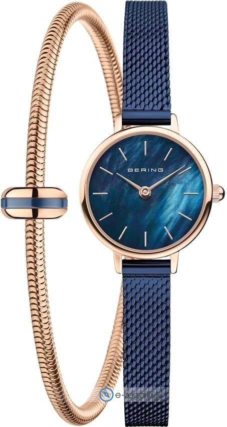 Damski zegarek Bering 11022-367-GWP to zegarek, który dzięki swemu wzornictwu zawsze będzie prezentował się dobrze. Nieschematyczny wygląd czasomierza osiągnięto także dzięki tarczy w kolorze granatowym. Aktualna godzina zaprezentowana jest w sposób analogowy co intuicyjnie pozwala ją odczytać. Koperta jest w kolorze różowo złotym szeroka jest na 22 mm oraz ma grubość 6 mm - w kształcie okrągłym.