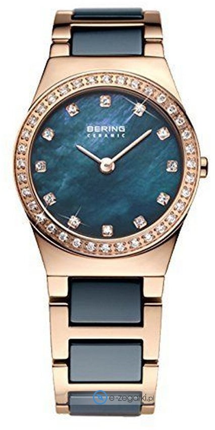 Damski zegarek Bering 32426-767 to zegarek, który dzięki swemu wzornictwu zawsze będzie prezentował się dobrze. Styl zapewnia wysokiej klasy tarcza w kolorze niebieskim. Aktualna godzina prezentowana jest w sposób analogowy co intuicyjnie pozwala ją odczytać. Koperta w barwach koloru różowo złotego szeroka jest na 26 mm - posiada okrągły kształt.