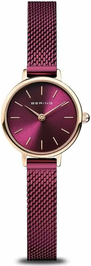 Model damski 11022-969 marki Bering z rodziny Bering Classic. Ciekawy wygląd zegarka osiągnięto m.in. poprzez tarczę w kolorze fioletowym. Pokazana metodą analogową bieżąca godzina jest czytelna i szybka do odczytania. Koperta w odcieniach koloru różowo złotego szeroka jest na 22 mm oraz ma grubość 6 mm - ma okrągły kształt.