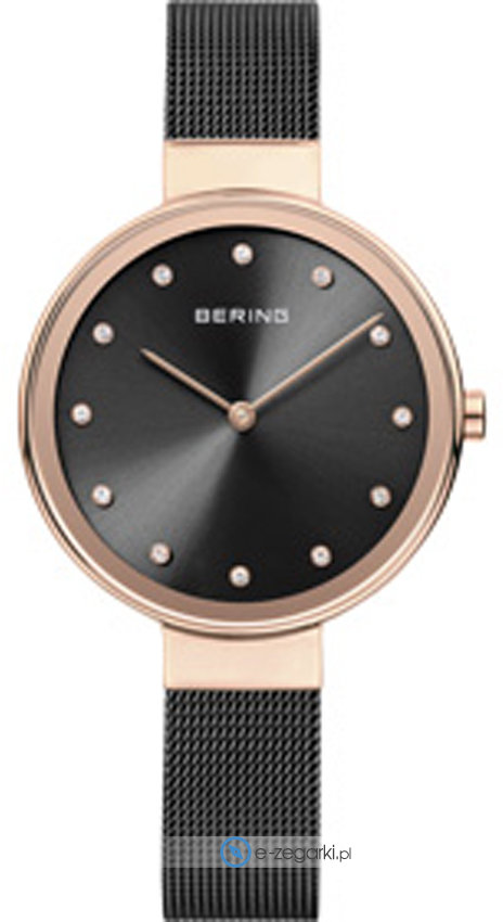 Zegarek damski 12034-166 marki Bering to stylowe połączenie funkcjonalności a także modnego designu. Model ten w gamie pozostałych zegarków tego producenta występuje w serii Bering Classic. Atrakcyjną konstrukcję zegarka osiągnięto dzięki tarczy w kolorze czarnym. Aktualna godzina zaprezentowana jest w sposób analogowy co niezmiernie łatwo pozwala ją odczytać. Koperta w barwach koloru różowo złotego szeroka jest na 34 mm oraz ma grubość 5 mm - ma okrągły kształt.