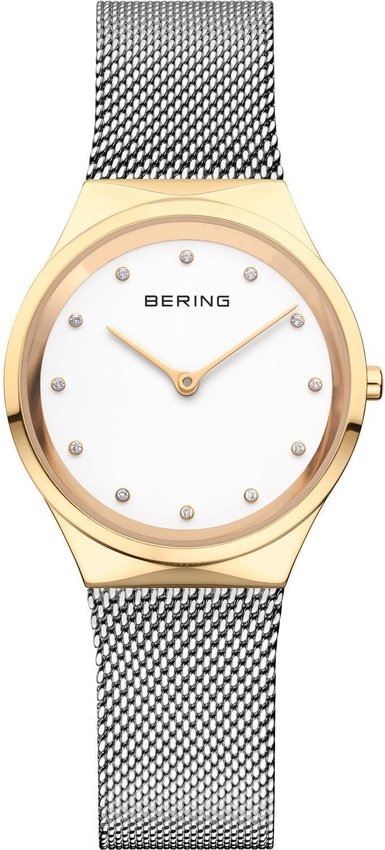 Zegarek damski 12131-010 marki Bering to idealne połączenie funkcjonalności oraz ciekawego wzornictwa. Model ten w gamie innych zegarków tego producenta występuje w serii Bering Classic. Wysokiej jakości cyferblat zegarka pokryto białym kolorem. Pokazana metodą analogową aktualna godzina jest czytelna i szybka do sprawdzenia. Koperta w odcieniach koloru złotego szeroka jest na 31 mm oraz ma grubość 6 mm - ma okrągły kształt.