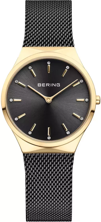 Zegarek damski 12131-132 zalicza się do rodziny Bering Classic marki Bering. Wysokiej trwałości tarczę zegarka ozdobiono czarnym kolorem. Pokazana metodą analogową bieżąca godzina jest czytelna i szybka do odczytania. Koperta jest w kolorze złotym o grubości 6 mm - w kształcie okrągłym.