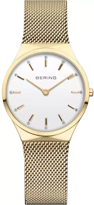 Bering 12131-331 to damski zegarek przeznaczony dla osób szukających zegarka z rodziny Bering Classic. Wysokiej trwałości cyferblat zegarka pokryto białym kolorem. Aktualna godzina zaprezentowana jest w sposób analogowy co intuicyjnie pozwala ją odczytać. Koperta jest w kolorze złotym szeroka jest na 31 mm oraz ma grubość 6 mm - charakteryzuje się okrągłym kształtem.