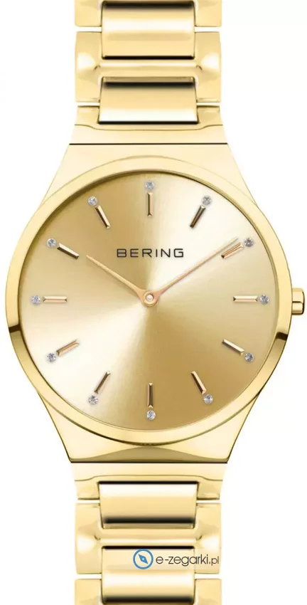 Bering 12131-733 - damski zegarek kierowany dla osób szukających zegarka z kolekcji Bering Classic. Nieschematyczny wygląd zegarka osiągnięto m.in. poprzez tarczę w kolorze złotym. Zegarek ten prezentuje godzinę w formacie analogowym dzięki czemu odczyt jest bardzo łatwy. Koperta w barwach koloru złotego szeroka jest na 31 mm oraz ma grubość 6 mm - w kształcie okrągłym.