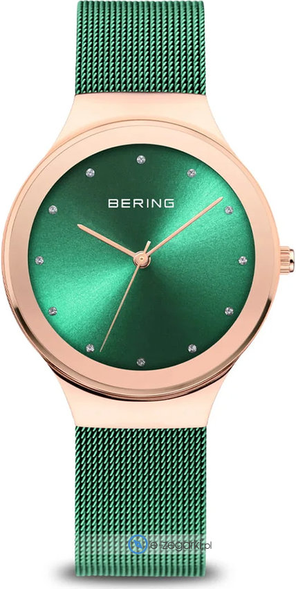 Bering 12934-868 - damski zegarek kierowany dla osób szukających zegarka z kolekcji Bering Classic. Ciekawą konstrukcję czasomierza uzyskano dzięki tarczy w kolorze zielonym. Pokazana metodą analogową aktualna godzina jest czytelna i prosta do odczytania. Koperta jest w kolorze różowo złotym szeroka jest na 34 mm oraz ma grubość 7 mm - ma okrągły kształt.