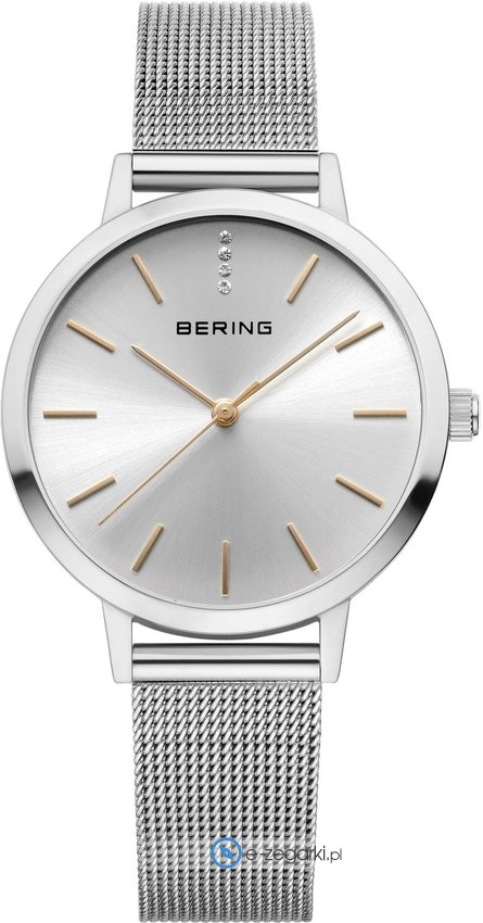 Zegarek damski 13434-001 marki Bering to idealne połączenie funkcjonalności a także ciekawego wzornictwa. Model ten jest z kolekcji Bering Classic. Tarcza zegarka jest w kolorze srebrnym. Zegarek ten pokazuje godzinę w formacie analogowym dzięki czemu odczyt jest intuicyjny. Koperta w barwach koloru srebrnego szeroka jest na 34 mm oraz ma grubość 7 mm - ma okrągły kształt.
