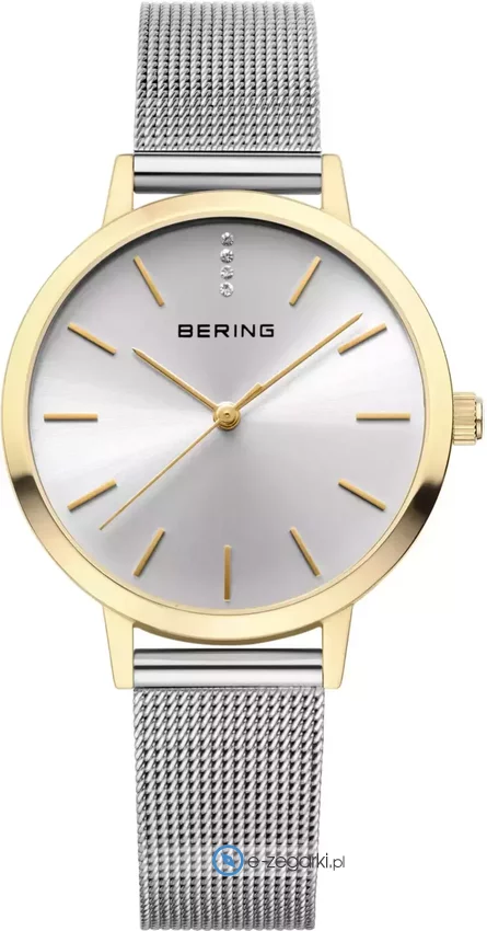 Bering to marka, która od lat cieszy się uznaniem klientów na całym świecie, dzięki swojemu unikalnemu podejściu do tworzenia czasomierzy. Każdy zegarek tej marki jest starannie zaprojektowany i wykonany z dbałością o najmniejsze detale. Model 13434-014 to doskonały przykład połączenia estetyki i praktyczności. Jego srebrna tarcza, złota koperta i bransoleta ze stali nierdzewnej tworzą harmonijną całość, która będzie pasować do każdej stylizacji.
