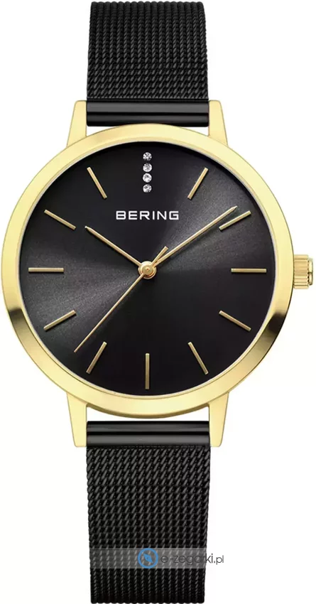 Damski zegarek 13434-132 z serii Bering Classic marki Bering to połączenie estetyki oraz oryginalnych mechanizmów. Charakteru dodaje wysokiej klasy tarcza w kolorze czarnym. Zegarek ten pokazuje godzinę w formacie analogowym dzięki temu odczyt jest bezproblemowy. Koperta została ozdobiona kolorem złotym szeroka jest na 34 mm oraz ma grubość 6 mm - wyróżnia się okrągłym kształtem.