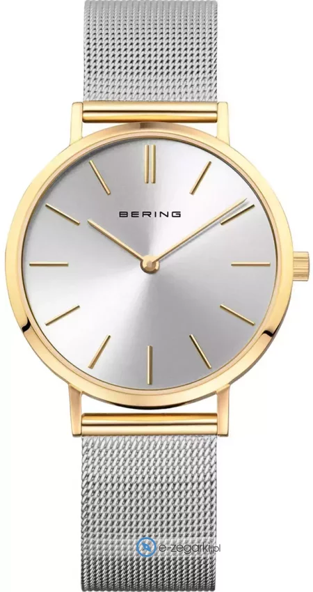 Damski zegarek 14134-011 z kolekcji Bering Classic marki Bering to połączenie smaku i ciekawych funkcji. Niebanalną konstrukcję czasomierza uzyskano z pomocą tarczy w kolorze srebrnym. Pokazana metodą analogową bieżąca godzina jest czytelna i łatwa do sprawdzenia. Koperta jest w kolorze złotym szeroka jest na 34 mm oraz ma grubość 6 mm - ma okrągły kształt.
