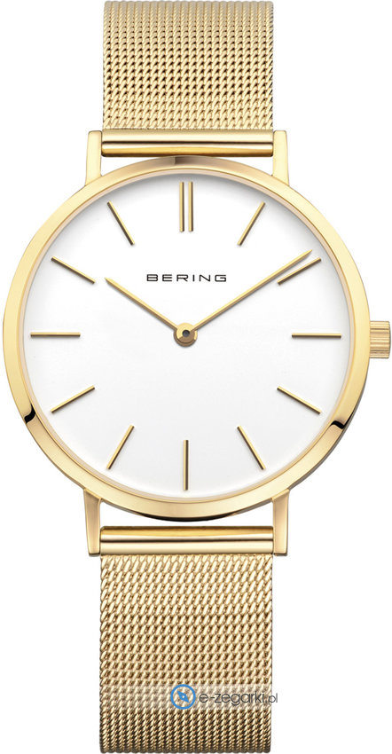 Zegarek 14134-331 marki Bering to elegancki zegarek naręczny damski, który posiada pomysłowe rozwiązania i funkcje. Model ten występuje w kolekcji Bering Classic. Niebanalny wygląd zegarka osiągnięto m.in. poprzez cyferblat w kolorze białym. Koperta jest w kolorze złotym szeroka jest na 30 mm oraz ma grubość 6 mm - posiada okrągły kształt.