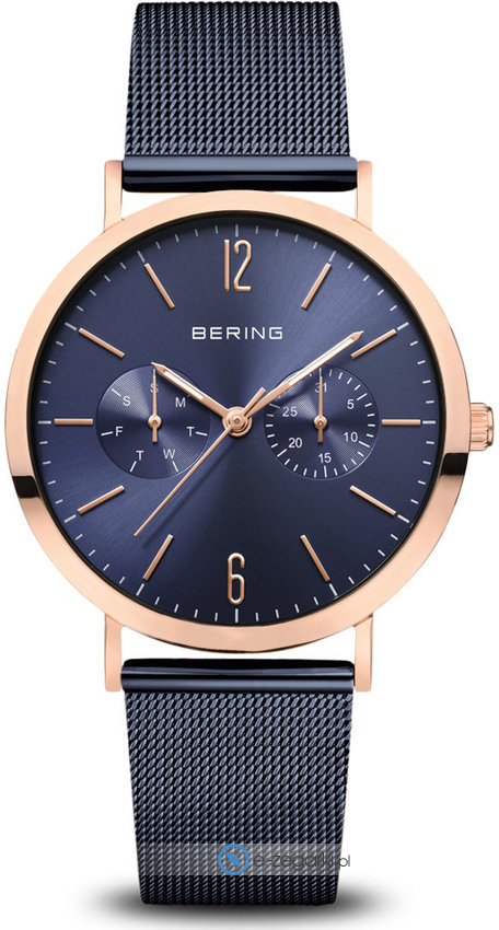 Zegarek damski 14236-367 marki Bering z kolekcji Bering Classic. Styl zapewnia wysokiej jakości tarcza w kolorze granatowym. Godzina prezentowana jest w sposób analogowy co bez trudu pozwala ją odczytać. Koperta jest w kolorze różowo złotym szeroka jest na 36 mm oraz ma grubość 8 mm - w kształcie okrągłym.