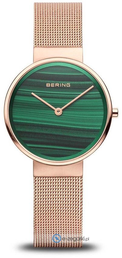 Model 14531-368 marki Bering to elegancki zegarek naręczny damski, który wyposażono w pomysłowe rozwiązania i funkcje. Charakterystyczny wygląd zegarka osiągnięto m.in. poprzez cyferblat w kolorze zielonym. Aktualna godzina prezentowana jest w sposób analogowy co niezmiernie łatwo pozwala ją odczytać. Koperta jest w kolorze różowo złotym szeroka jest na 31 mm oraz ma grubość 6 mm - charakteryzuje się okrągłym kształtem.