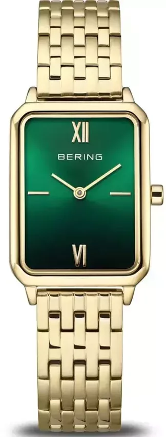 Zegarek 17423-738 marki Bering to elegancki zegarek naręczny damski, który posiada pomysłowe rozwiązania oraz funkcje. Model ten należy do serii Bering Classic. Stylu nadaje wysokiej jakości tarcza w kolorze zielonym. Aktualna godzina zaprezentowana jest w sposób analogowy co bez trudu pozwala ją odczytać. Koperta jest w kolorze złotym o grubości 6 mm - posiada prostokątny kształt.